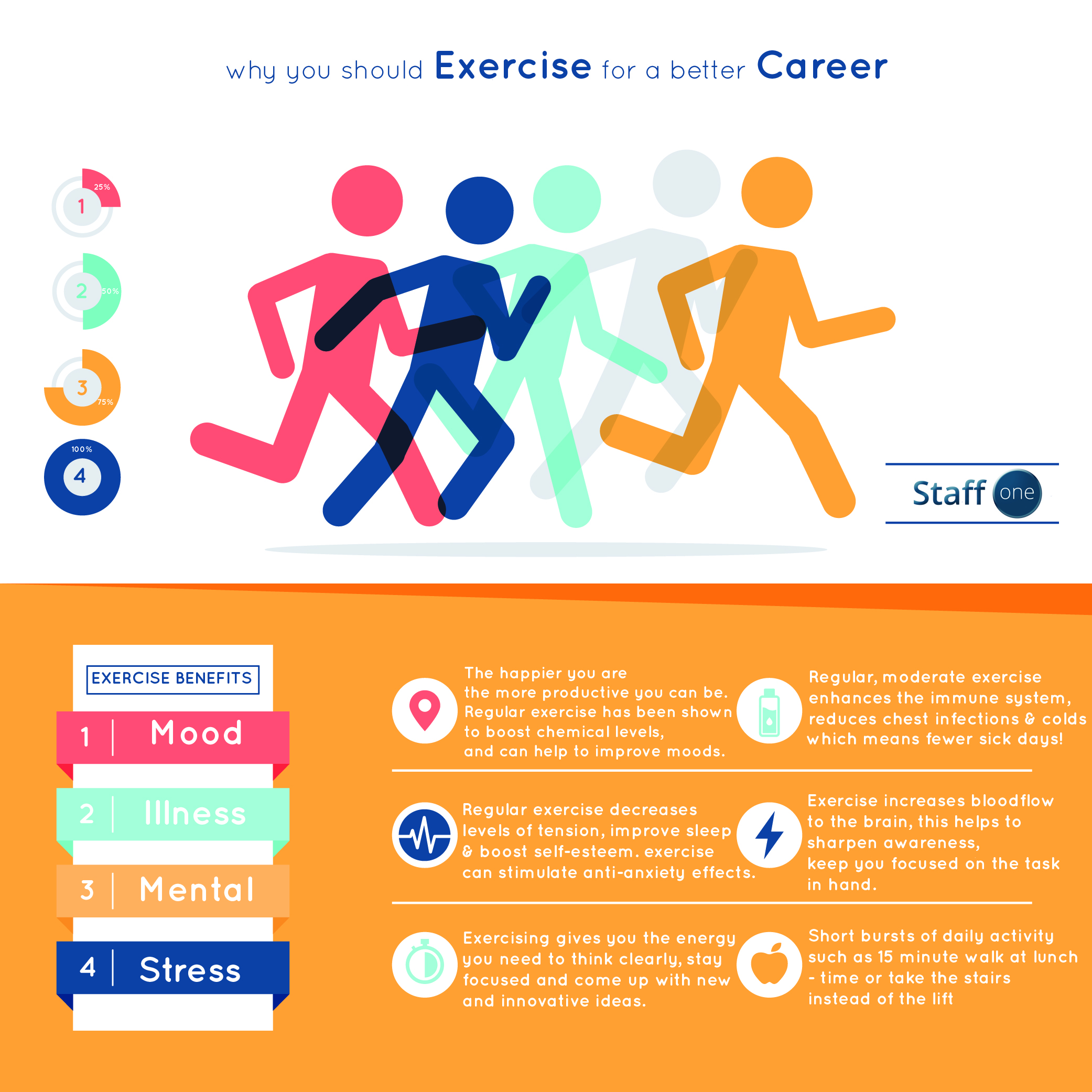 Regular exercise has been proven to reduce stress, lower feelings of anxiety & depression, boost self-esteem and improve sleep. And within the workplace, this can translate to you feeling happier, healthier and more motivated.
